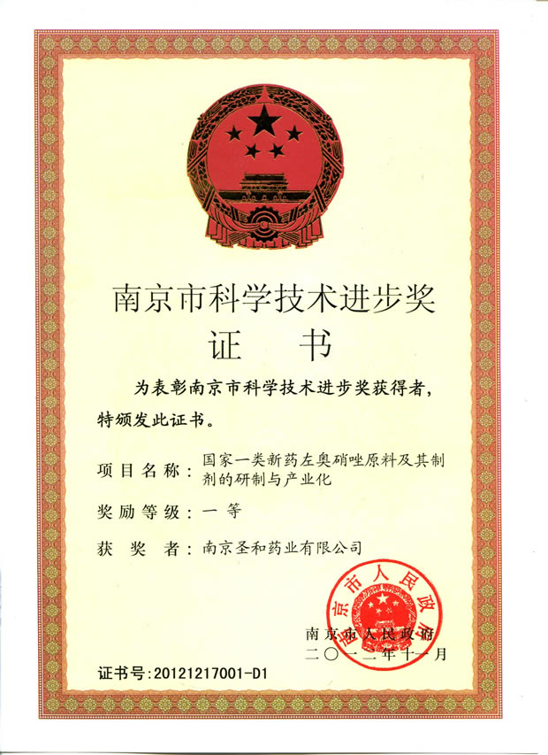 2012南京市科學(xué)技術(shù)進(jìn)步獎 左奧硝唑原料及其制劑的研制和產(chǎn)業(yè)化